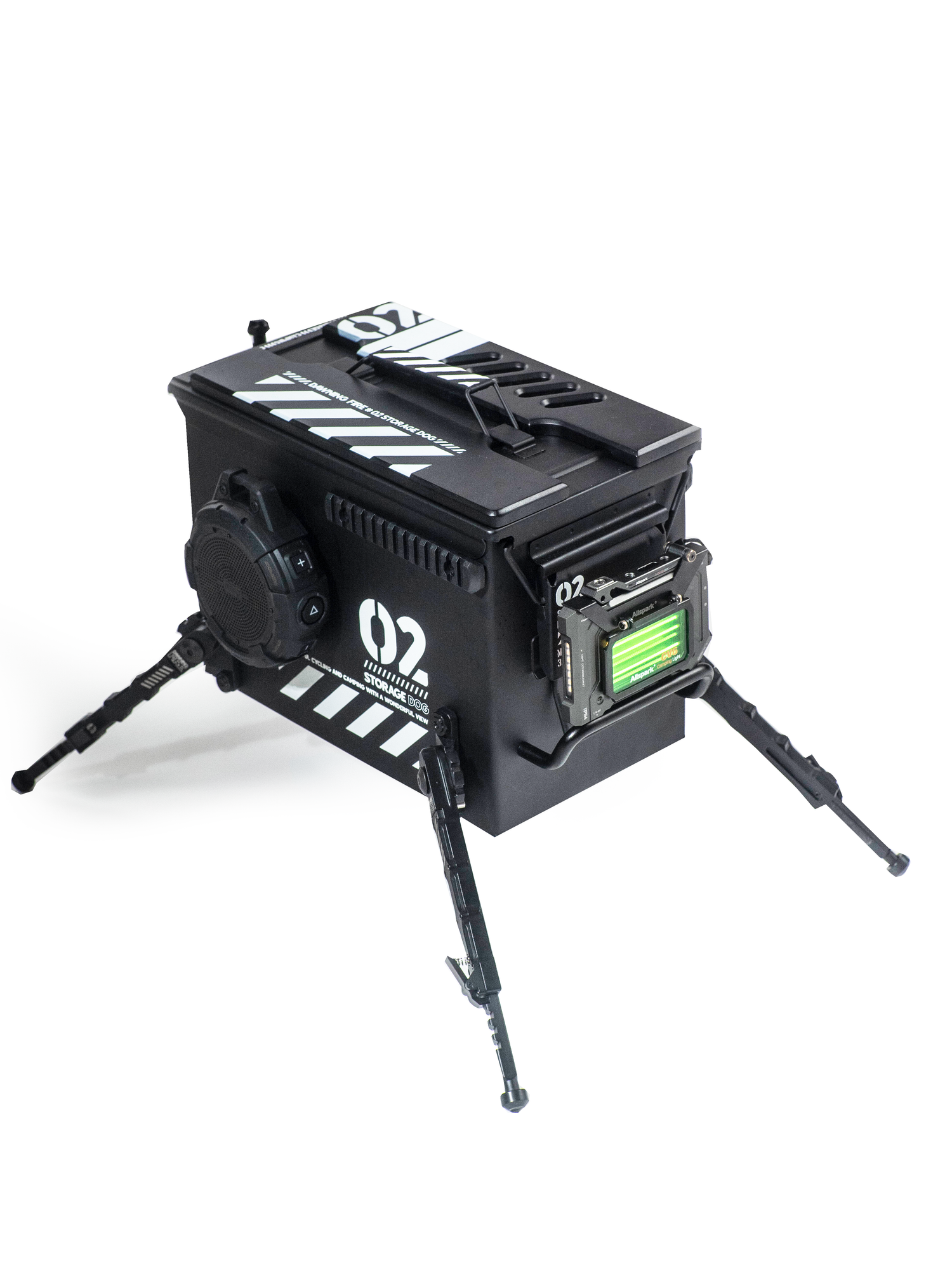 Redesigned military ammo box with adjustable tactical legs and walnut boards. Stable, functional, and stylish — your loyal “camping guard dog” waiting to be adopted.